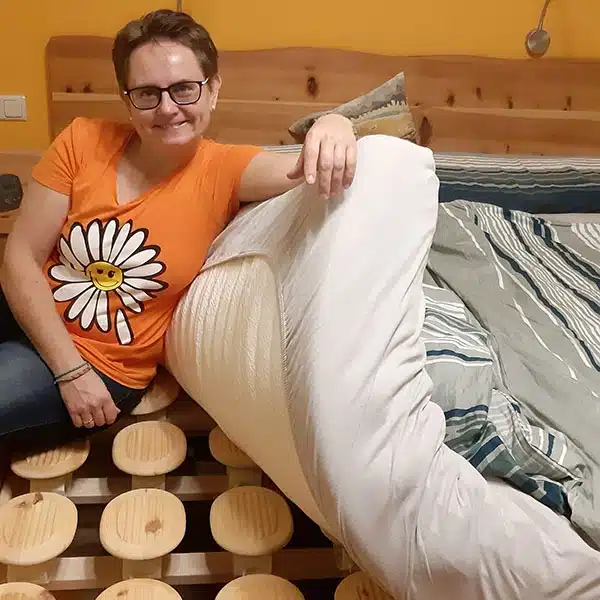 „Ich hatte immer Schwierigkeiten und Schulterschmerzen. Jetzt kann ich auf der Seite liegen, weil da so eine schöne Kuhle ist, in die ich mich so richtig schön reinlegen kann.„