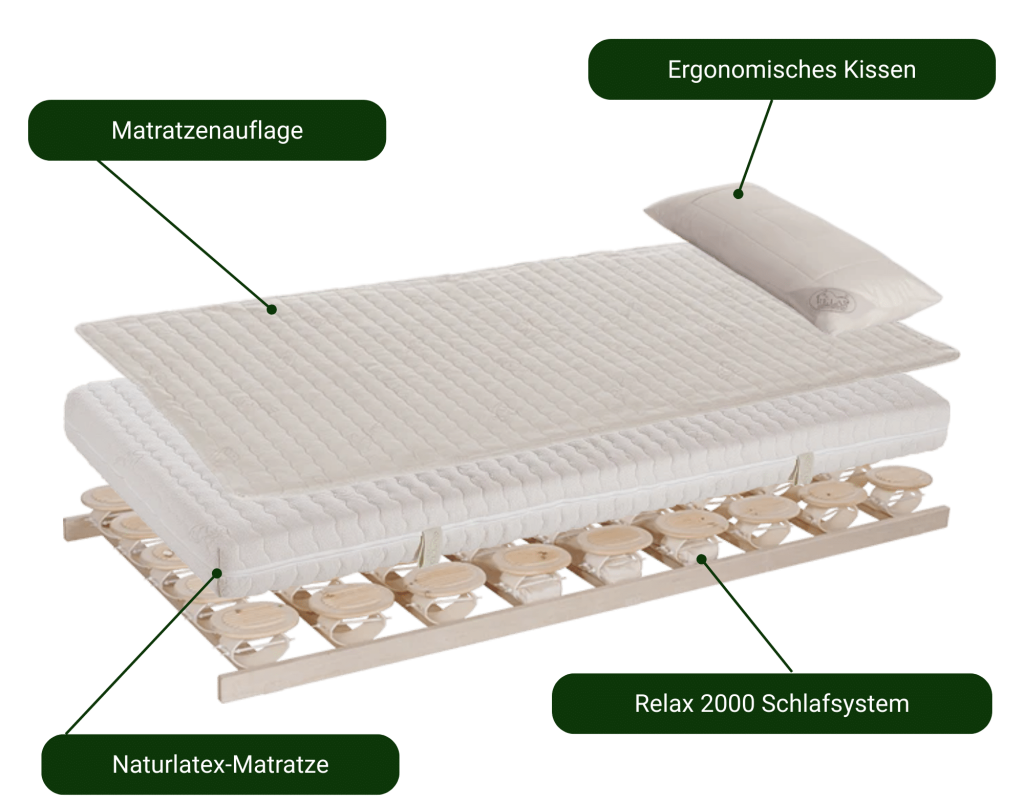 Qualität hat ihren Preis – aber sie rechnet sich. Der Einstieg in das RELAX 2000 Tellersystem (Buche) beginnt bei 1.383 €. Ein komplettes, perfekt abgestimmtes System (Relax 2000 Teller, Naturlatex-Matratze, Auflage & Kissen) liegt bei einer Investition von 2.791 €.
